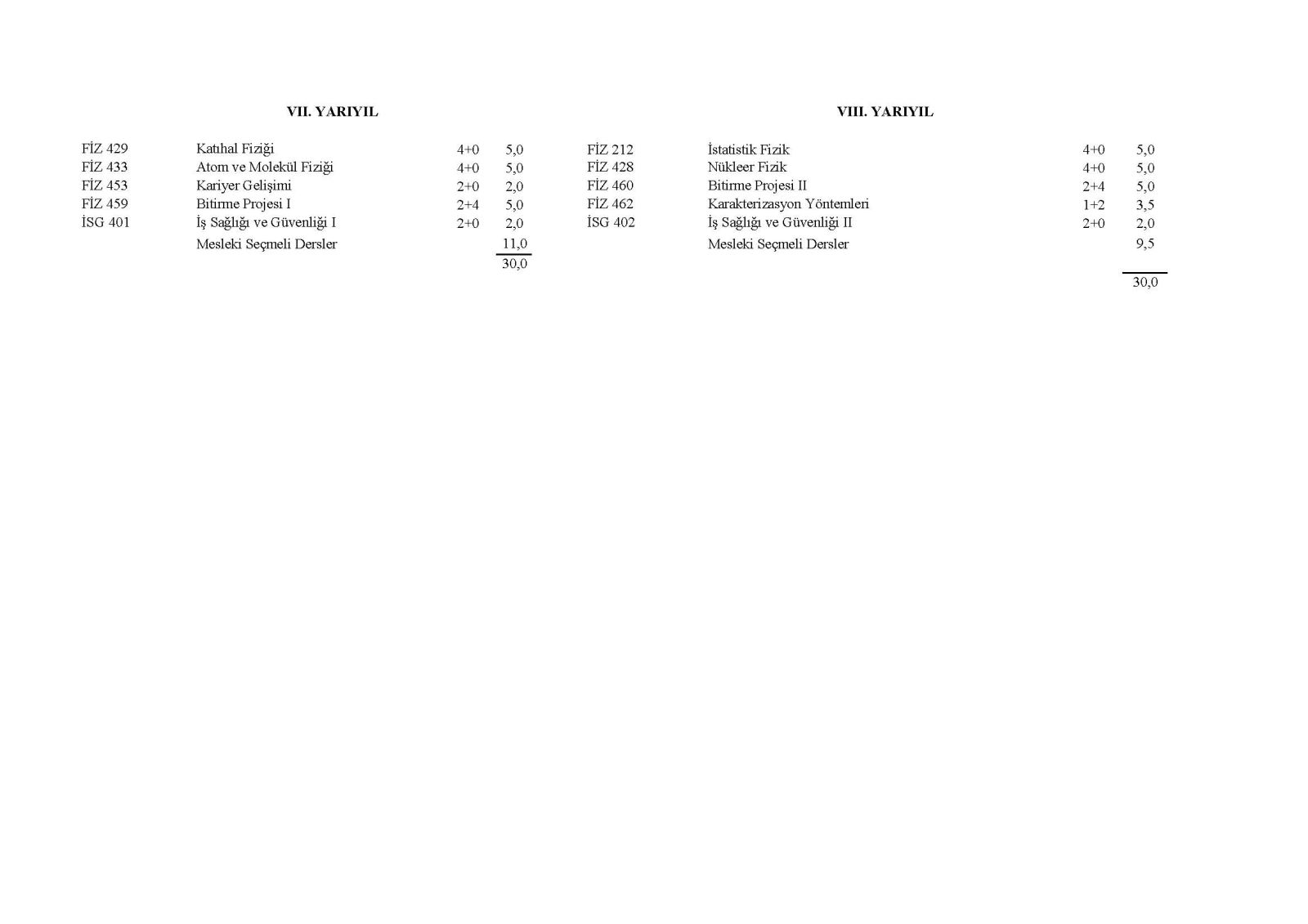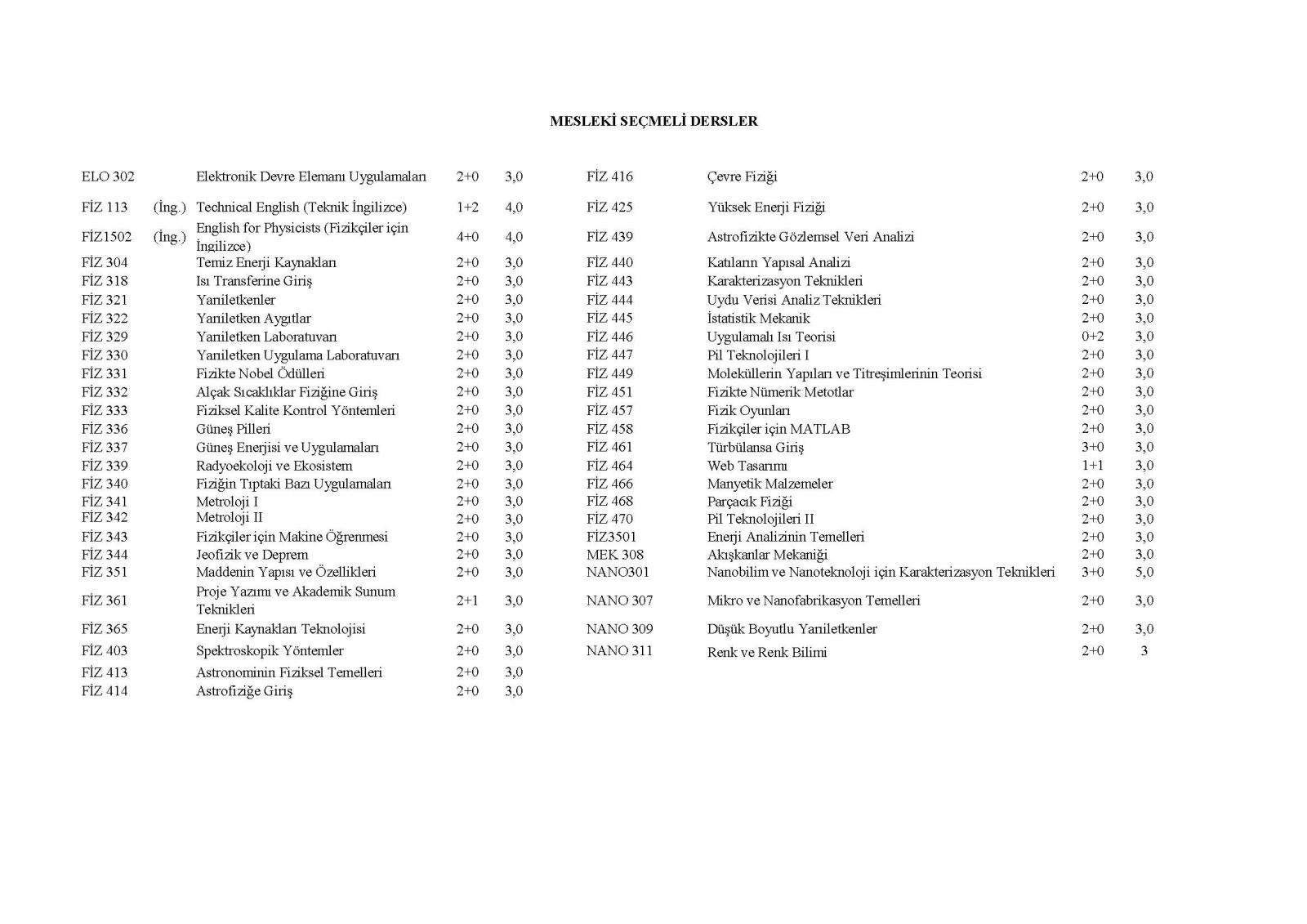 Fizik Lisans Programından Mezuniyet için Gereken Seçmeli ve Mesleki Seçmeli Ders Kredileri Tablosu için tıklayınız.